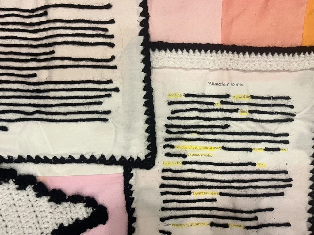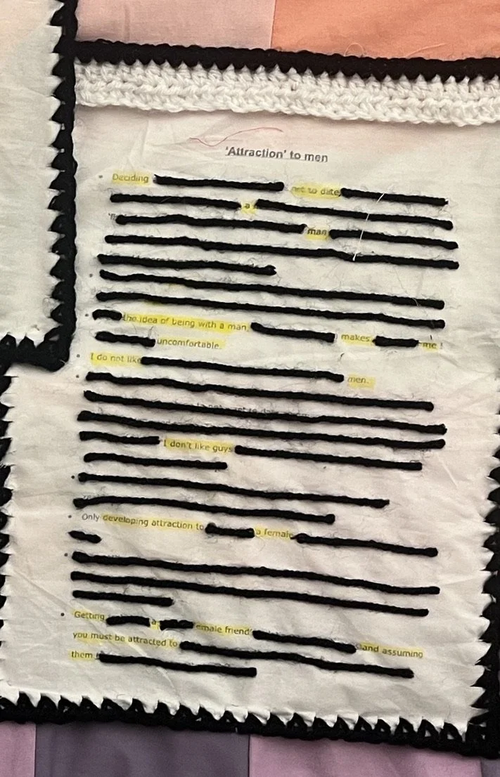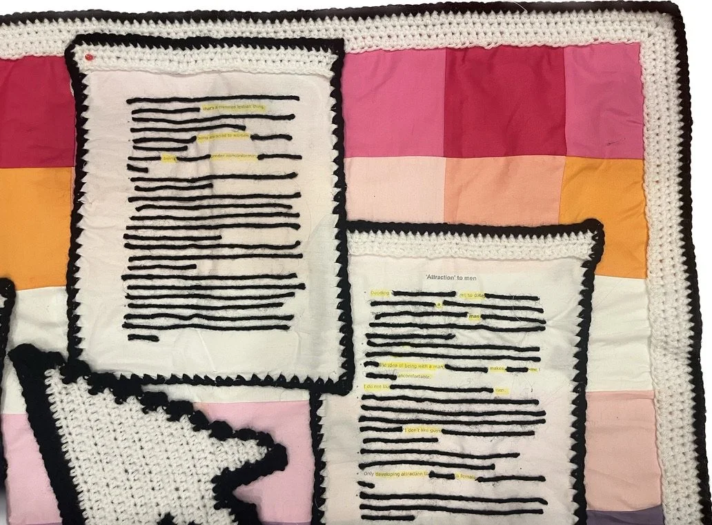 2023 - Mixed media - quilting, crochet, solvent transfer, beadwork, highlighter, and glue Lesbian Masterdoc